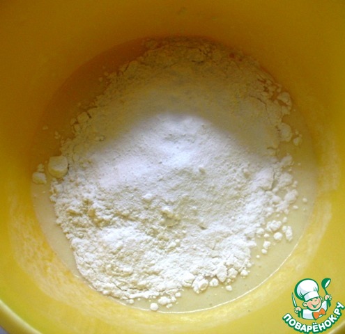 Добавить муку и разрыхлитель теста. Тщательно перемешать тесто до однородного состояния (тесто по консистенции как густая сметана).