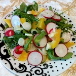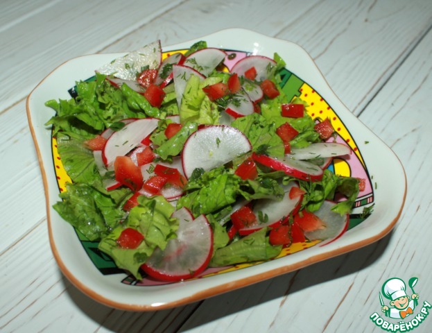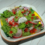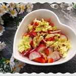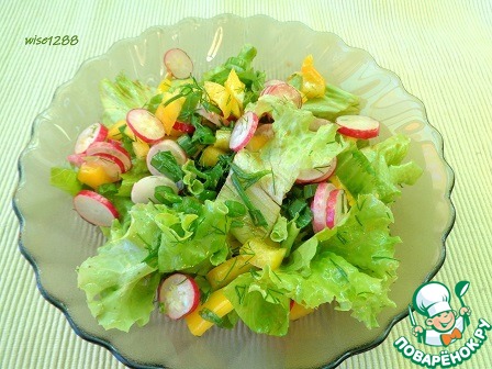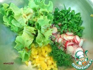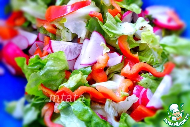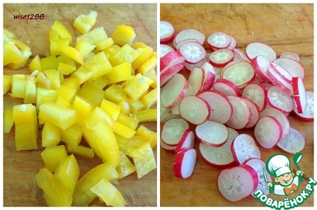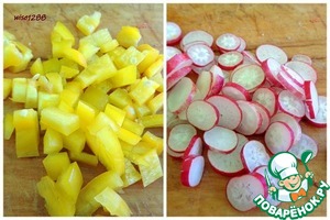 Сладкий перец нарезать кубиками. Редис – кружочками.