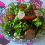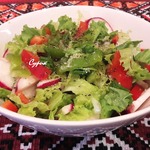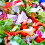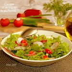 В салате простое сочетание овощей и зелени с энергией цвета и витаминов. Заправлен оливковым маслом и соевым соусом. Полезное решение для быстрой трапезы.