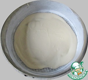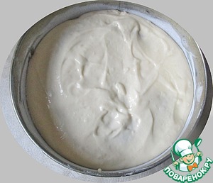 Форму диаметром 20 см смазываем растительным маслом и присыпаем мукой. Выливаем 1/3 теста