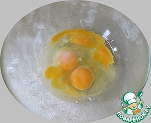 В миску разбиваем три яйца, всыпаем соль и сахар
