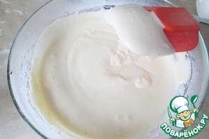 Взбиваем яйца миксером до пены. Добавляем сметану с майонезом и всыпаем разрыхлитель теста. Ещё немного взбиваем.