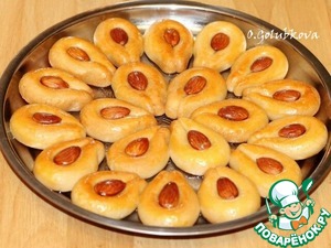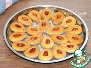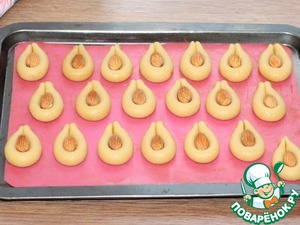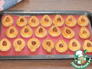 11. Выложить заготовки печенья на застеленный противень. Если бумага для выпечки, то смазываем маслом, если силиконовый коврик - не смазываем. В середину печенья положить орех. Выпекать печенье в разогретой до 180 С духовке минут 15.