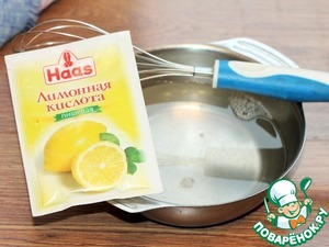 13. Приготовим сироп. Сироп лучше готовить по вкусу. Я приготовила кисло-сладкий. Можно приготовить ванильный для сластен. Воду в небольшом сотейнике (лучше с "носиком") довести до кипения и всыпать сахар и лимонную кислоту (или ванилин, или лимонный сок). Пробуем и доводим сироп до растворения сахара и до кипения.