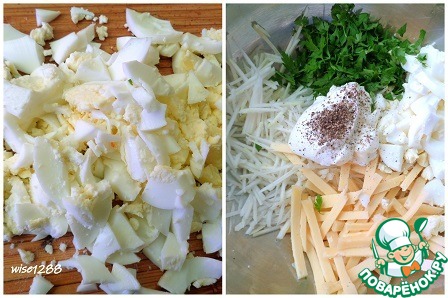 Яйцо измельчить произвольно. Соединить все ингредиенты.