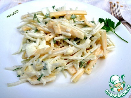 Простое гармоничное сочетание ингредиентов придаёт салату неординарный вкус с характерной сливочной ноткой сыра, легкой сладости кольраби и свежести зелени. Полезности используемых продуктов впечатляют масштабами.