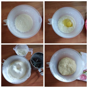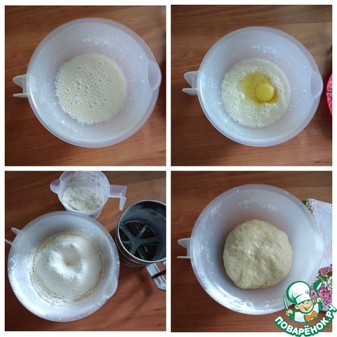 Делаем тесто. Молоко нужно подогреть. Растворяем в нём дрожжи, добавляем сахар и 1 ст л муки. Перемешиваем венчиком и ждём минут 10 "шапочку" от дрожжей. Разбиваем яйцо, соединяем. Просеиваем муку понемногу, добавляем соль. По мере замешивания понемногу добавляем подсолнечное масло. Готовое тесто накрыть влажным полотенцем и убрать в теплое место на 1,5 часа. Я грею для этого духовку до т-50 С.
