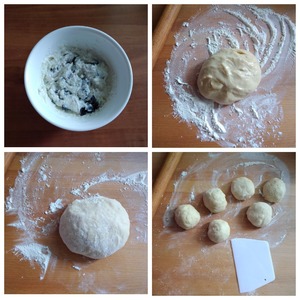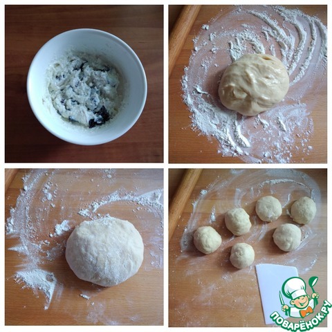 Делаем начинку. Творог раньше перетирался с сахаром. Сегодня я упрощу и вместо сахара возьму сахарную пудру. Она быстрее растворится в твороге. Добавила ванилин. Изюм запарила кипятком. Откинула на сито, обсушила бумажным полотенцем и добавила в творог. Начинка для ватрушек готова. Тесто поднялось, выкладываем его на рабочую поверхность, хорошо обминаем. Делим на 6 кусков. Скатываем в шарики, приминаем.