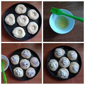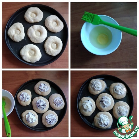 Раскатываем тесто в круги, толщиной ~1,5 см. Подходящем по размеру дном от стопки или стаканчика, предварительно смазав его маслом, намечаем углубления для начинки. Ставим в тепло ещё минут на 15. Выкладываем начинку творожную. Опять ставим в тепло минут на 10. Разбиваем яйцо в чашку и подвзбиваем его. Кисточкой обмазываем верх сформированных ватрушек вместе с начинкой. Далее греем духовку до т-180 С и выставляем время 20 минут. Ориентируйтесь по своей духовке.
