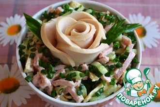 На вареные белки кладём кружки огурцов, на них кружки маслин. Это будут глаза. Из колбасы вырезаем ушки. Учтите, что от формы вырезанных деталей сильно зависит восприятие оформления салата в целом.