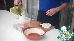 Мясо разрезать поперек на 2 части, сложить в посуду для маринования, и залить полученным маринадом. Мариновать в холодильнике от 12 часов до суток.