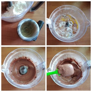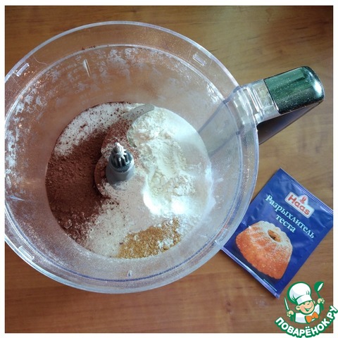 Я буду замешивать тесто в комбайне. Можно воспользоваться блендером или просто ручным венчиком. В чашу выложила просеянную муку, разрыхлитель, какао-порошок, сахар, имбирь и кардамон. Я использую разрыхлитель для теста от HAAS.