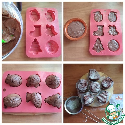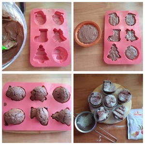 Для выпечки кексов я буду использовать силиконовые формочки. Они у меня новогодние. Форму намочила водой. Раскладываем тесто по формочкам на 2/3 высоты. Они сильно поднимутся. У меня форма на 6 кексов, остальное тесто я выложила в другую форму, которая по размеру с две таких формочки. Ставим в разогретую духовку до т-180 С на 15 минут. Ориентируйтесь на свою духовку. У меня небольшой эл. шкафчик на 18 л и печёт очень быстро. Проверяем кексы на "сухую лучину". Тесто не пристаёт к лучине деревянной, значит готовы. Кексы очень поднялись. Даём им полностью остыть и легко вынимаем из формочек, не сломав мелких деталей. Для устойчивости кексов, можно их основание подрезать, т к формочки у меня с рисунком рельефным и кексы следует перевернуть. Я не буду подрезать, я просто их помещу в бумажные формы, где они будут устойчиво стоять. Остывшие кексы присыпаем сахарной пудрой, как-будто снежком.