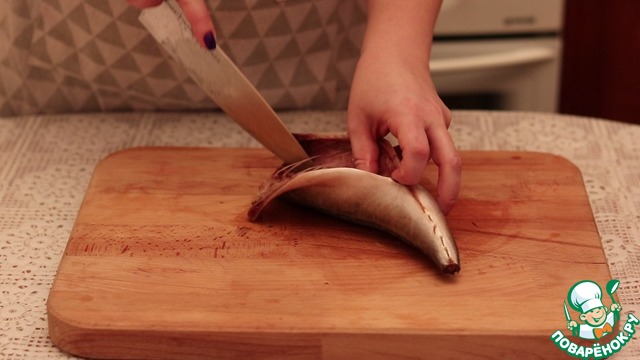 Для начала разберем скумбрию. Отрезаем голову, хвост, потрошим и промываем. Так же аккуратно обрезаем плавники. Внимаем хребет и косточки.