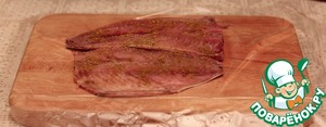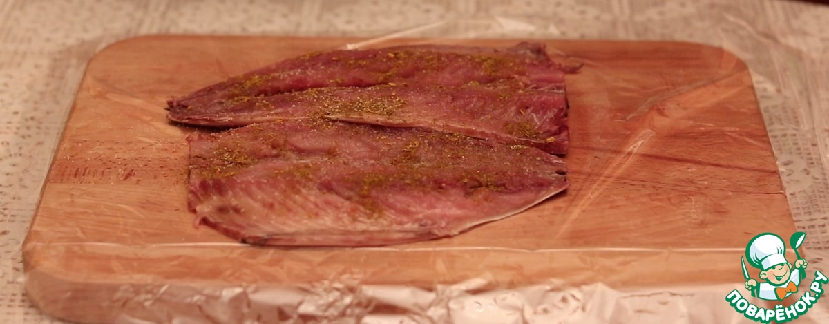 Маринуем рыбу солью, специями и посыпаем желатином.