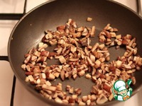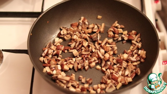 Грибы обжариваем на сковороде до готовности, обязательно выпарив сок из них. Остужаем до комнатной температуры.