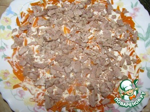 Отваренную морковь нарезать соломкой. Выложить на блюдо первым слоем. Посолить, поперчить.