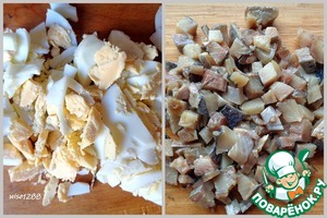 Яйцо нарезать произвольно. Иваси почистить, удалить все косточки, нарезать мелко.