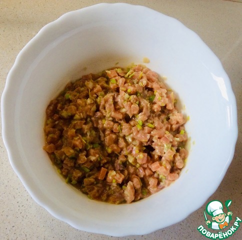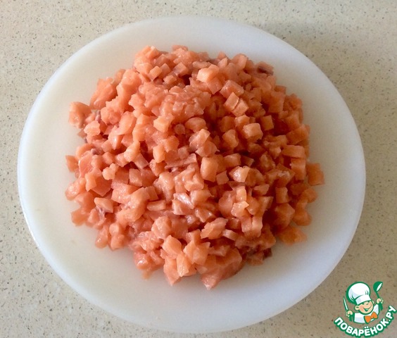 Лосось очистить от кожи и костей и нарезать кубиками 1х1 см. Предварительно можно чуть подморозить, чтобы было легче резать. Сырую рыбу в любом случае надо пару дней подержать в морозилке