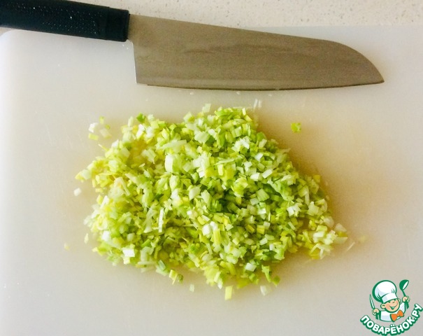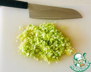 Как можно мельче нарезать лук. У меня лук-порей, но можно использовать зелёный или репчатый