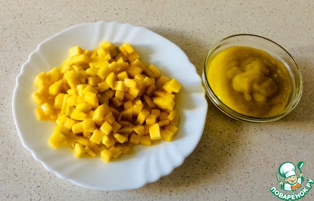 Тем временем кубиками 1х1 см нарезать манго. Небольшую часть фрукта пропюрировать блендером. Для пюре лучше взять мякоть вокруг косточки
