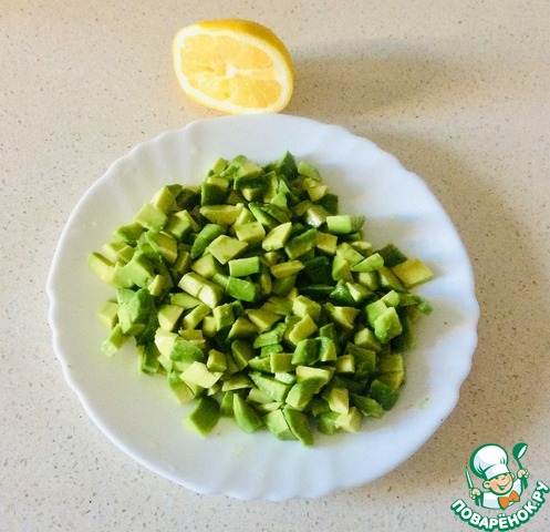 Такими же кубиками 1х1 см нарезать оба авокадо. Слегка сбрызнуть половинкой лимона, чтобы не потемнели