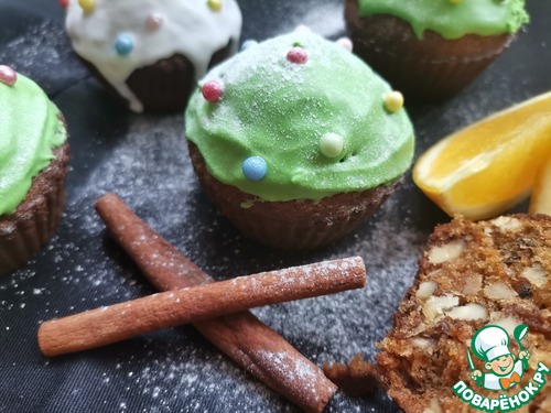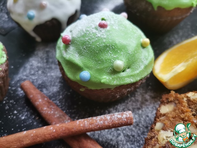Если нет времени испечь Новогодний торт, то такие маффины - малышки, которые похожи на ёлочки, могут прекрасно украсить Ваш праздничный стол. Ароматные морковные маффины с корицей и цитрусовой ноткой, большим количеством орехов и изюма, ммм... это так вкусно! Такая выпечка наполнит Ваш дом запахом Новогоднего праздника!