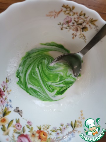 Глазурь готовим как указано на упаковке. Но чтобы создать новогоднее настроение я добавила капельку пищевого красителя и сделала глазурь зеленой.