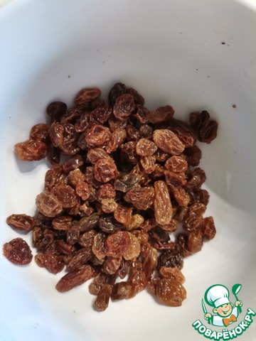 Изюм моем и на 15 минут заливаем кипятком. Затем обсушим.