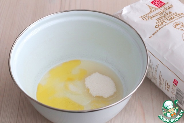 В миску добавить 1 яичный белок, добавить сахар (2 ст. ложки), добавить соль (1/2 ч. ложки), добавить 2 ст. ложки оливкового масла.
