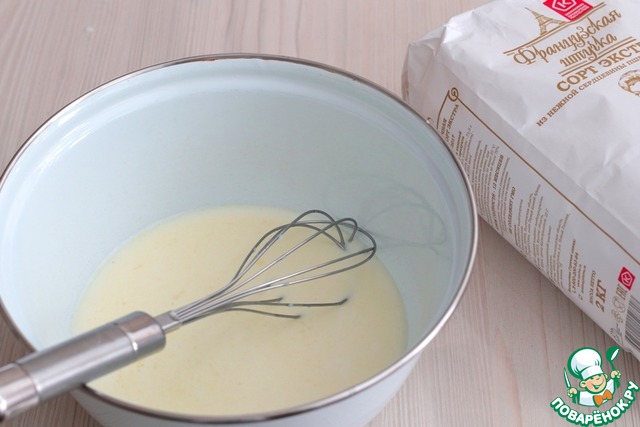 Смесь взбить венчиком. Далее добавить 200 мл. теплого молока.