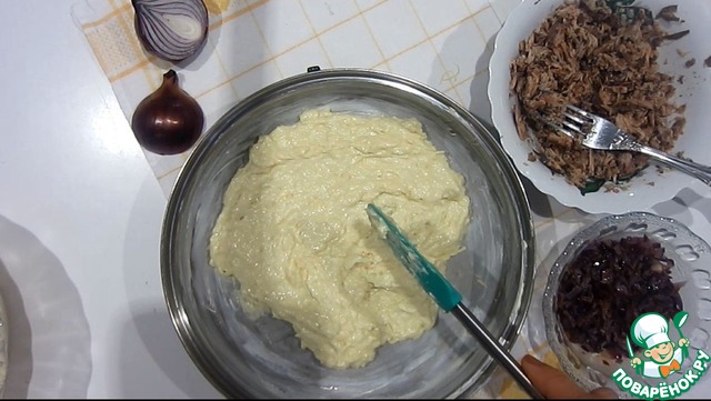 В форму диаметром 24 см. выкладываем половину теста. Затем измельченный тунец и жареный лук. Выкладываем оставшееся тесто.