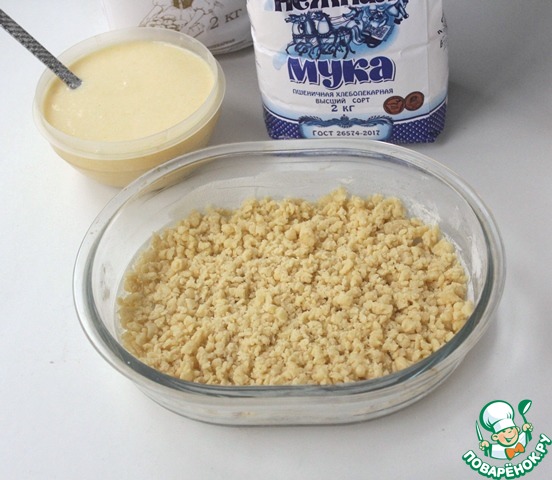 В форму, у меня где то размером 20*18, выложить половину мучных крошек.