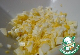 Очистить от скорлупы и тоже нарезать кубиком. -