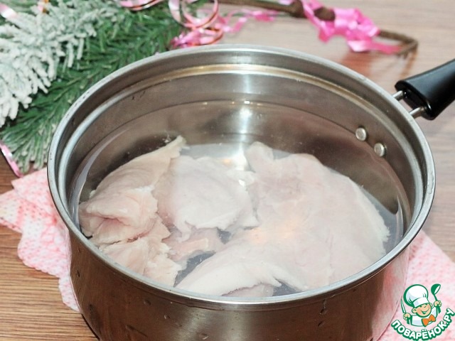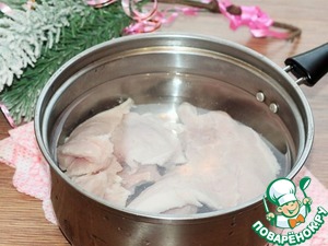 1. Приготовим суфле. Отварить мясо в подсоленной воде с добавлением лаврового листа (1 шт) и перца горошком (5 шт). Бульон слить, мясо охладить.