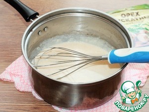 12. Остальное молоко и бульон постепенно добавить в сотейник, постоянно помешивая. В последнюю очередь влить молоко с крахмалом, посолить и венчиком взбивать до загустения около 5 минут. Перец по желанию.