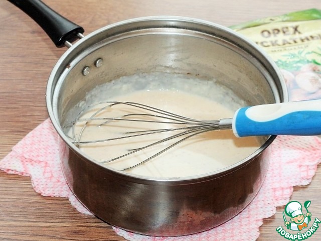 4. Растопить в сотейнике сливочное масло и вмешать муку. Тонкой струйкой влить молоко и взбить венчиком. Приправить солью, перцем и мускатным орехом и продолжать взбивать до небольшого загустения.