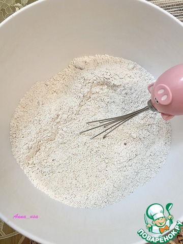 Просеять муку с содой, разрыхлителем, солью и корицей. Добавить сахар и хорошо перемешать.