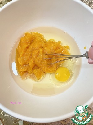 В отдельной посуде смешать растительное масло, яйцо и тыквенное пюре.