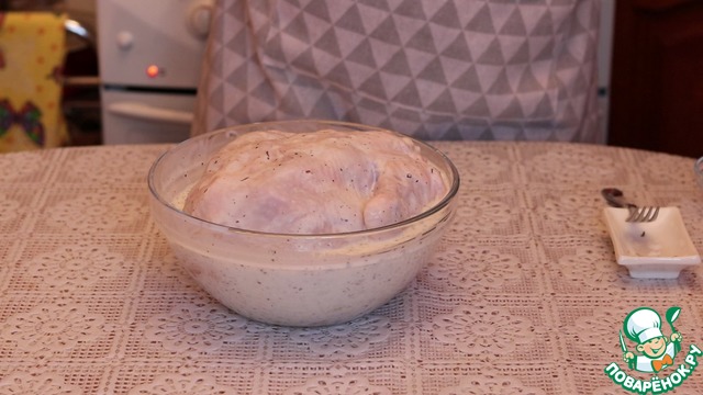 Приготовим маринад для курицы. В большую миску выливаем кефир. Добавляем базилик, пропущенный через пресс 3 зубчика чеснока, соль и перец. Все перемешиваем и кладем в маринад курицу. Обмазываем ее со всех сторон, даже внутри. Оставляем мариноваться пару часов. Лучше оставить на ночь. Тогда мясо будет мягче.