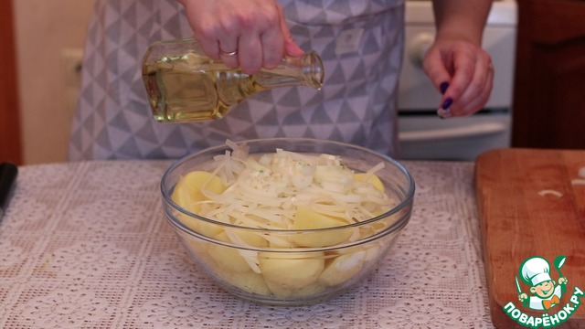 Смешиваем картофель, лук, чеснок в большой миске. Добавим соль, перец и растительное масло. Все перемешаем.