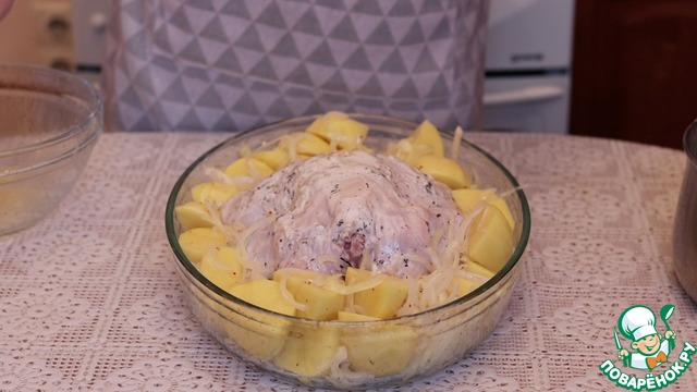 В центр, на противень, в котором будем выпекать, выкладываем промариновавшуюся курицу, а вокруг картофель с луком и чесноком. Отправляем в духовку разогретую до 180 градусов на 1 час. Но будем смотреть по готовности. Если курочка уже готова, а картофель еще нет, то курочку накройте фольгой и продолжайте готовить до полной готовности картофеля.