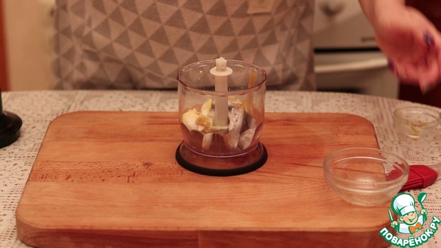 Подготовим соус. Все ингредиенты (куриное яйцо, горчица, лимонный сок, оливковое масло, анчоус, соль, перец) складываем в блендер и доводим все до однородного состояния.