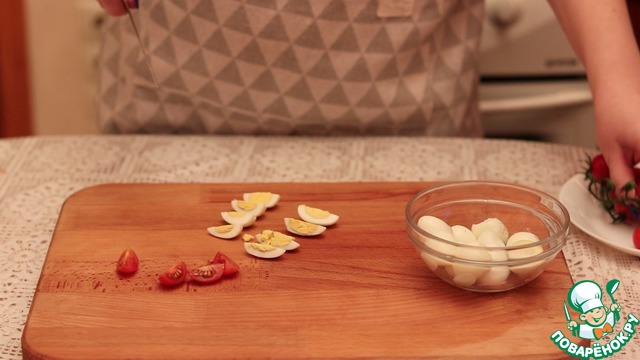 Перепелиные яйца, помидоры черри нарезаем на четвертинки.