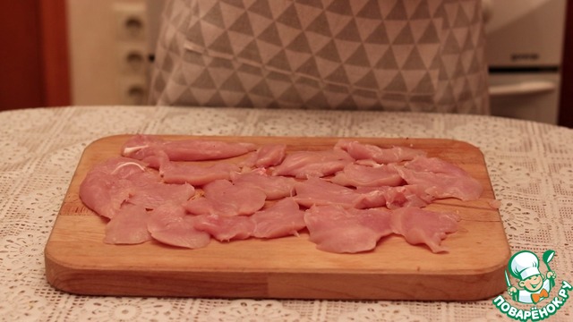 Куриную грудку нарезаем тонкими пластинками. Солим, перчим и сбрызгиваем растительным маслом.