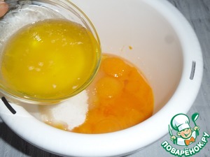 Затем добавляем чашу растопленное остуженное сливочное масло и растительное масло.