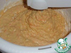 Затем в чашу выкладываем натертую морковь. Перемешиваем массу.