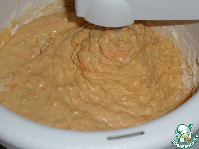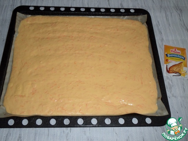 Выкладываем морковное тесто на противень, застеленный пергаментом или тефлоновым/силиконовым ковриком. Равномерно распределяем тесто.