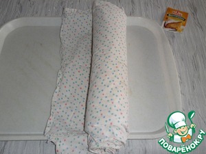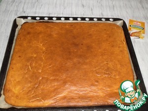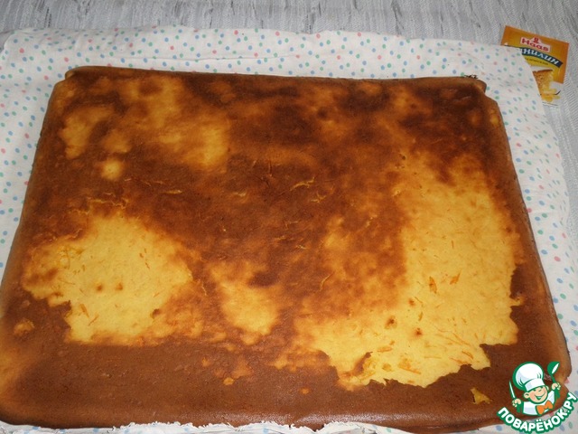Испеченный морковный корж вынимаем из духовки и переворачиваем противень на кухонное х/б полотенце. Убираем пергамент /коврик.
