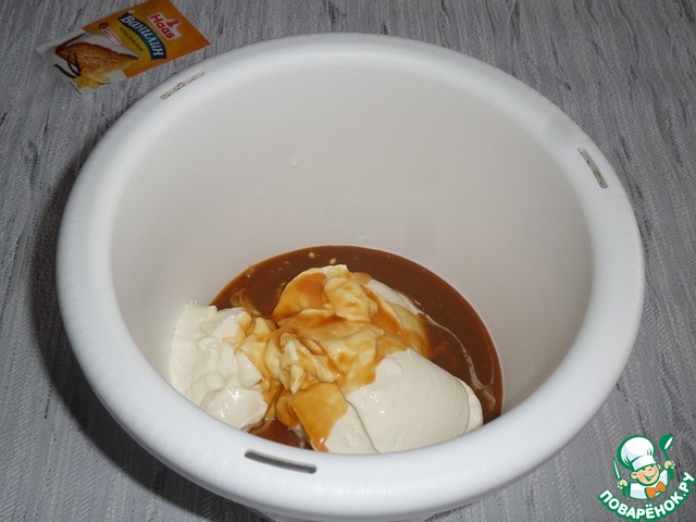 Готовим крем для начинки. В чашу миксера выкладываем творожный сыр и карамель ( если нет карамели, можно взять вареную сгущенку).